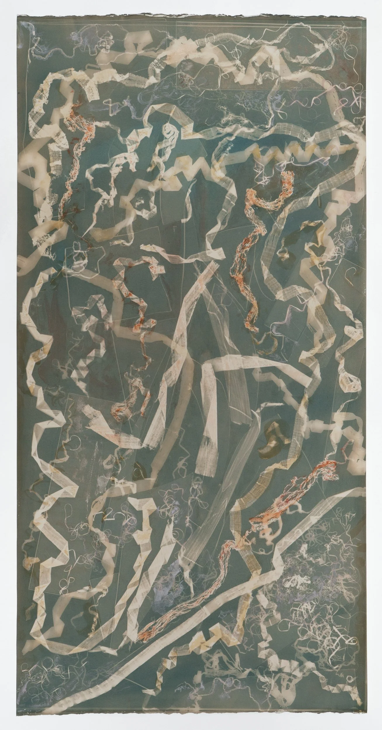 Spotting (exposed 6.20.25), cyanotype and earth pigments on paper, 42 3/8 x 21 3/8"